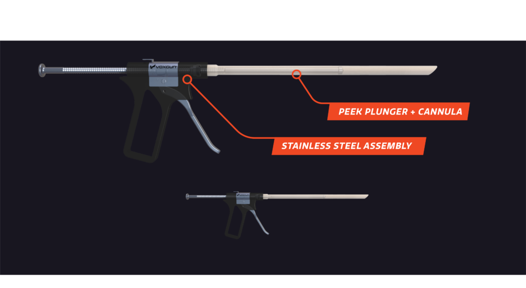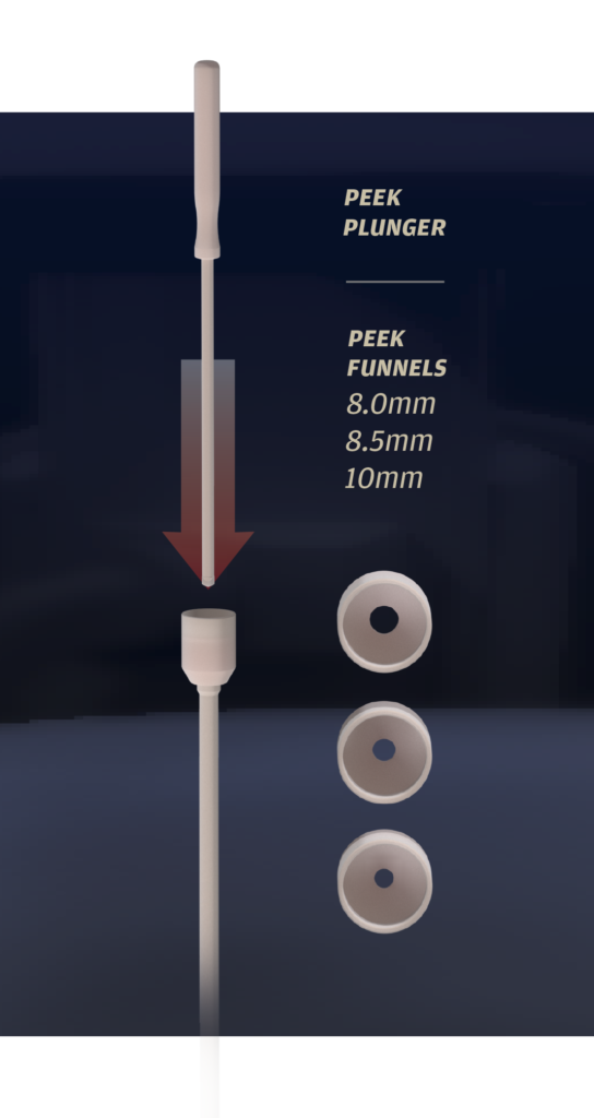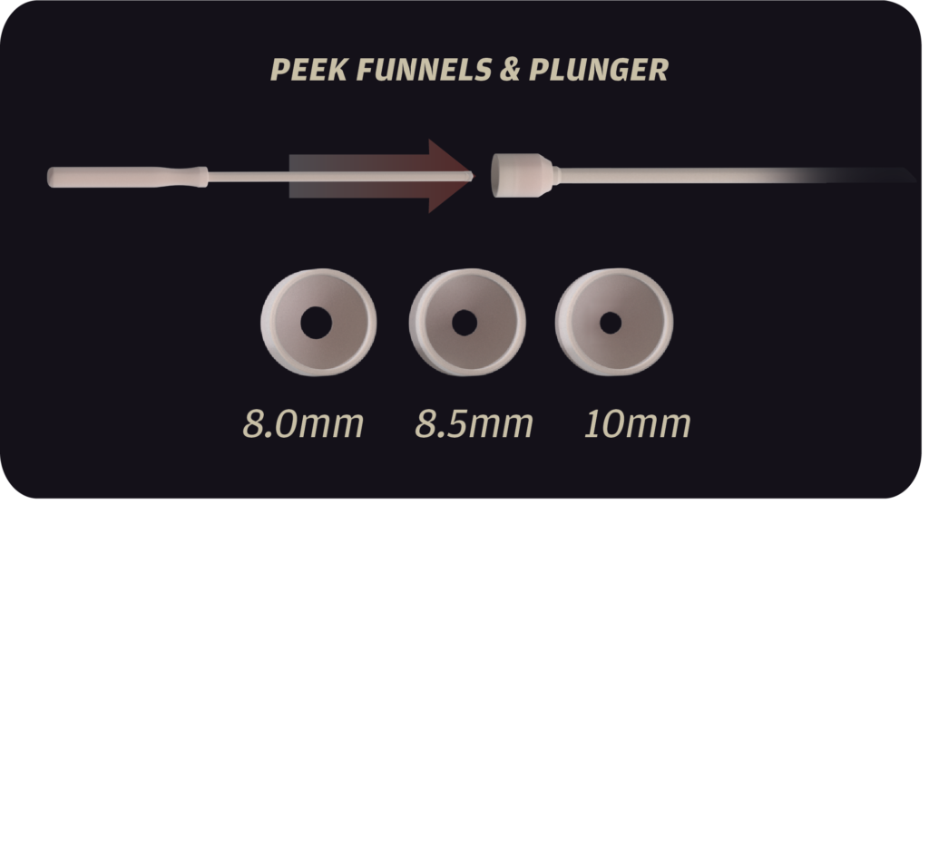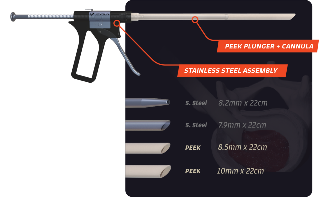 The reusable stainless steel assembly and interchangeable PEEK components provide a cost effective graft delivery system
